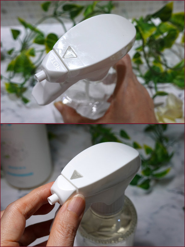 噴瓶也有安全設計,轉頭有三角形標示,要轉到液狀圖形的標示才能使用,轉到STOP字樣時噴頭就會鎖住,可以防止幼童玩耍時不小心按到。