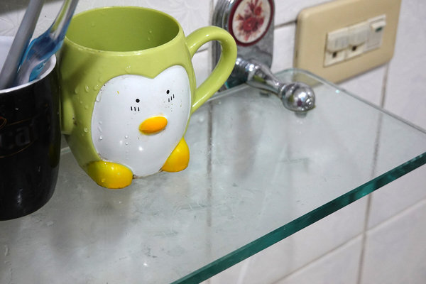 放牙刷、洗面乳的浴室玻璃層架或浴室鏡子也很適合用淨淨濃縮家事皂來幫忙清潔。調配只要1:80即可喔!