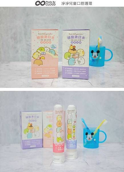 ▲滿滿的角落小夥伴,讓兒子愛不釋手,紫色的牙膏跟漱口水是葡萄口味,桃色牙膏則是草莓口味,粉色的漱口水是清新蜜桃口味,