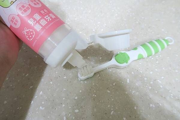 第一次接觸到這獨特氣壓孔直立牙膏設計,不但好壓、好放、更不用擔心小孩亂擠牙膏的問題,乾淨又方便,