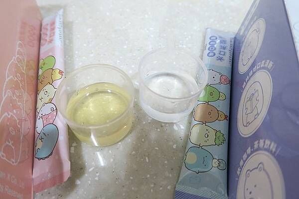 蜜桃口味漱口水帶點淺黃色,葡萄口味則是透明無色的。