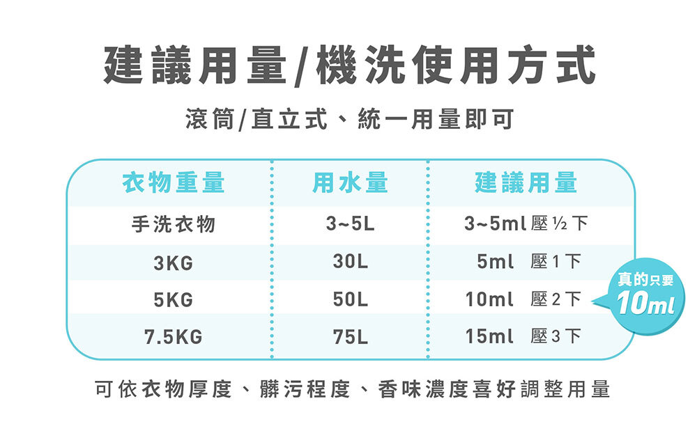 若是衣服較厚、較髒,可依洗衣需求調整適合的用量喔!