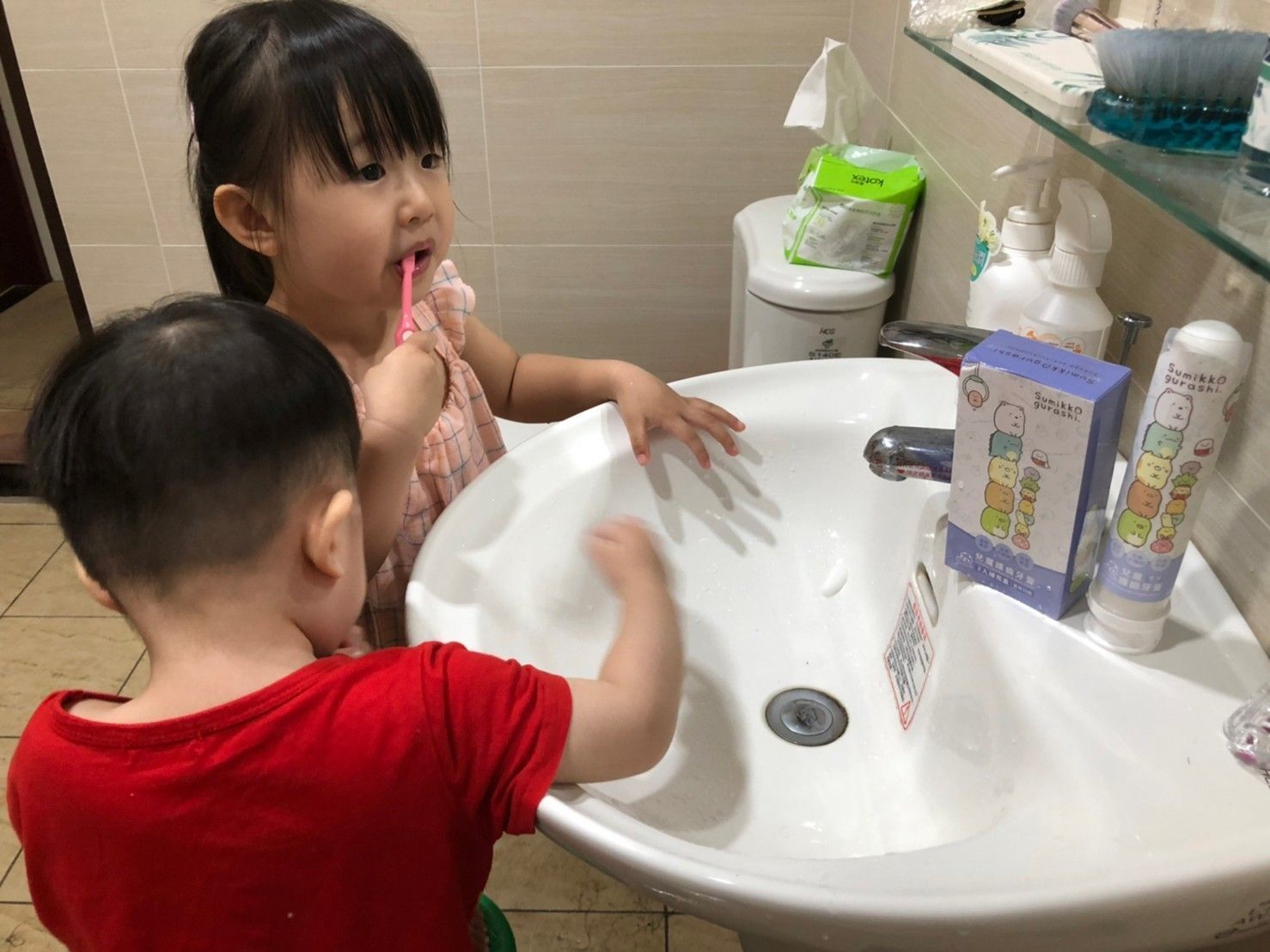 小兒子也在學習自己刷牙,看著姊姊學得有模有樣