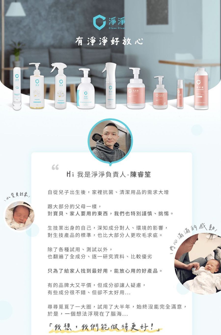 看了一下 CleanClean淨淨的故事是怎麼誕生的,負責人也是因家中有寶寶誕生,對於生活周遭的清潔用品變得特別講究,加上本身是生技業出身,