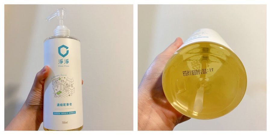 外觀很像沐浴乳,裡面金黃透明的高濃縮家事皂是以椰油皂、