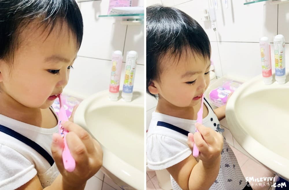 既然姑姑很滿意(?),那就二話不說來讓侄女親自試試看囉!光看到角落小夥伴就讓她很喜愛了,正當好奇到底裡面是什麼東西時,就被抓來浴室刷牙了(笑)。