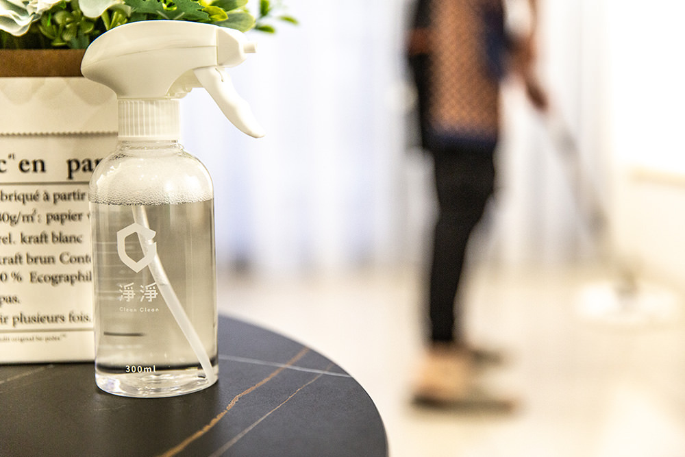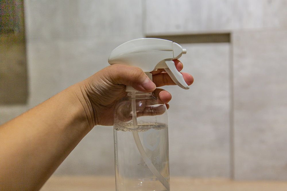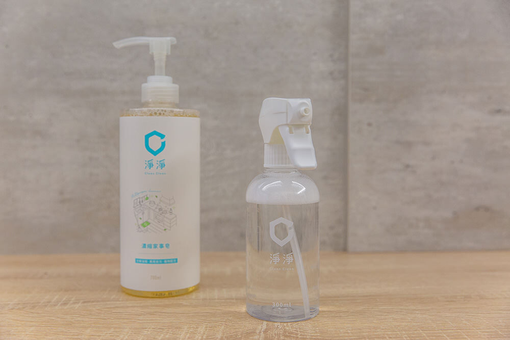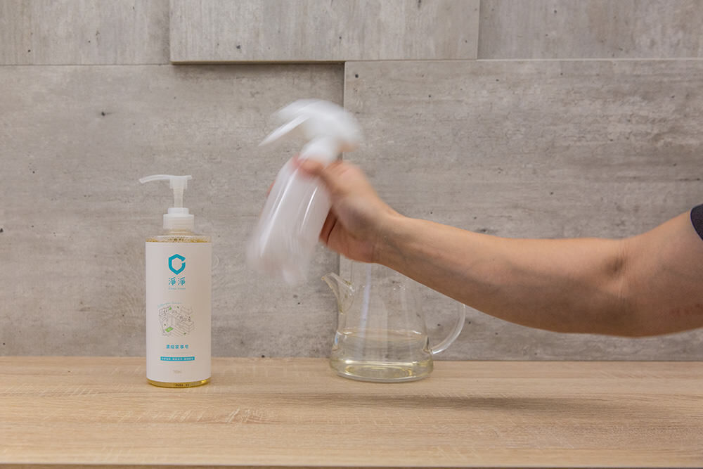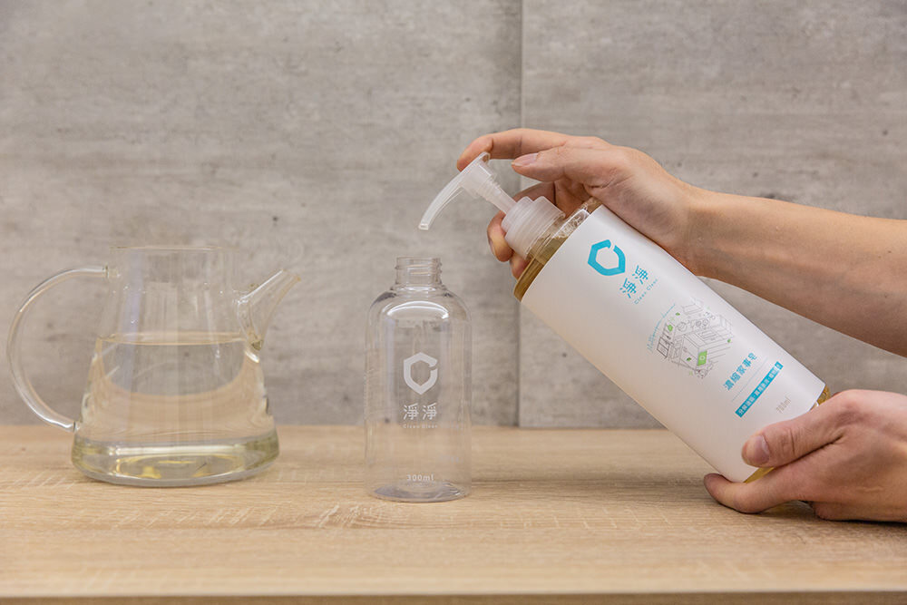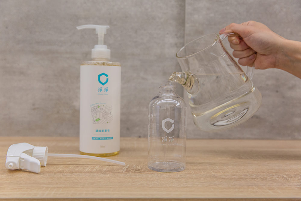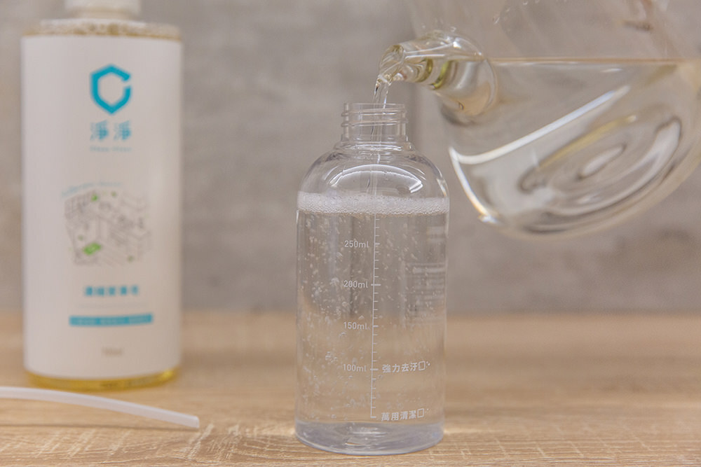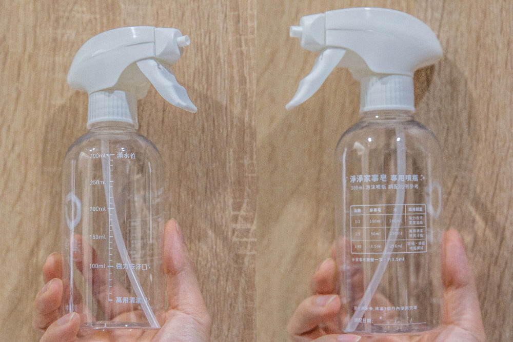 首次使用上我們按照輕度清潔比例1:80在噴瓶內調配清潔劑,步驟只需要在噴瓶內按壓一次濃縮家事皂一下(約3.5ml),然後再將水加至300ml 的刻度即完成調配。