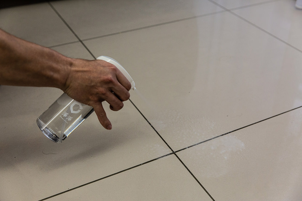 按壓噴瓶將泡沫噴灑在地板上,因為噴灑範圍滿大的,所以噴灑速度很快,靜置一會兒,再用拖把拖過之後就完成清潔了。