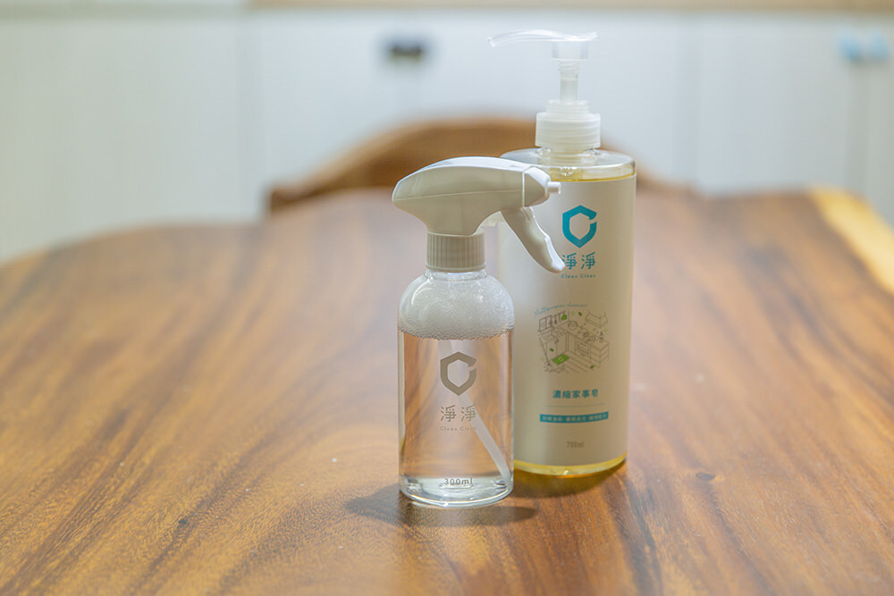 原木桌、木製電視櫃我們都使用相同比例的家事皂清潔劑噴灑之後擦拭,餐桌表面的油膜也變得很乾淨,而且這樣使用下來大約才用掉半瓶,換算下來不到3塊錢的價格,真的是非常划算。