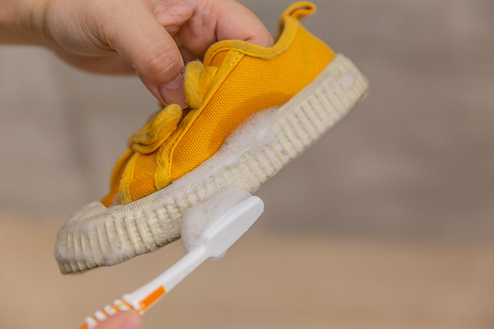 另外像是米寶的布鞋已經被他穿的很髒了,為求有效清潔,我們直接將濃縮家事皂擠一滴在布鞋上,然後使用刷子刷洗布鞋,效果也是非常明顯,馬上就潔白如新了。