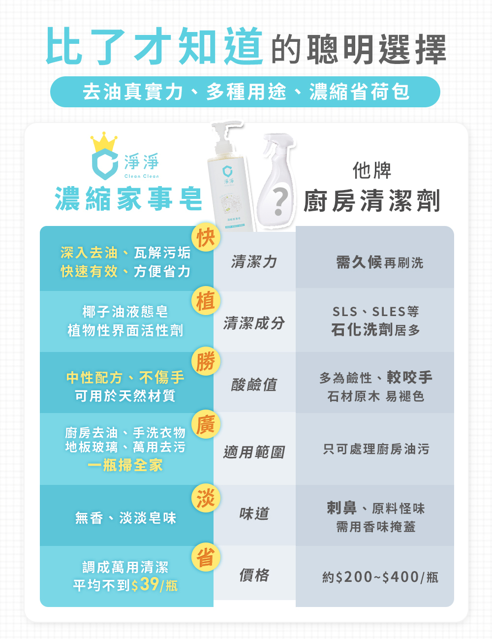 還在猶豫要不要入手淨淨濃縮家事皂嗎?看看廣大網友怎麼說!我們精心比較濃縮家事皂與他牌清潔劑的各種面向,也節錄網友對濃縮家事皂的各種好評,包括家庭主婦的真心推薦,以及餐飲業的重油汙實測。好不好用,一看就知道!