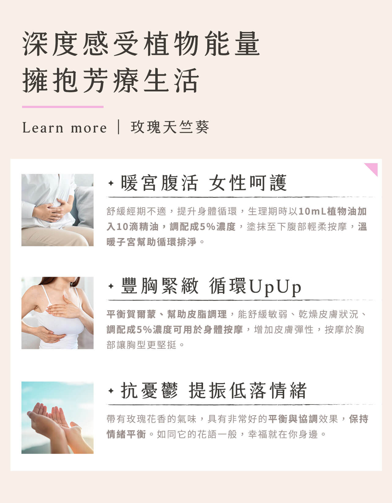 幫助女性平衡生理機能、有助於放鬆緊張情緒,療癒身心。